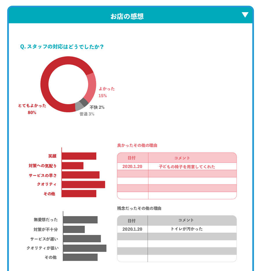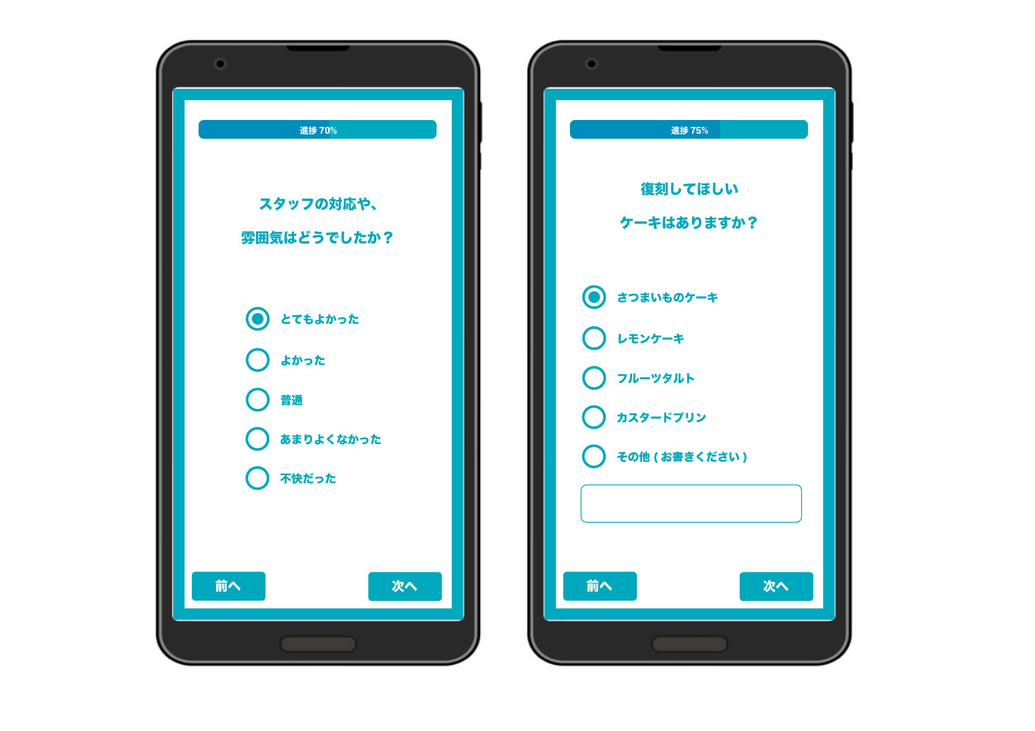 Koeerü 最大の特徴。それは、貴店オリジナルの質問に作り替えられるところです。 新たに加えたい質問があれば、事務局へご連絡いただけますと、IT チームと連携を とり再構築が可能です。